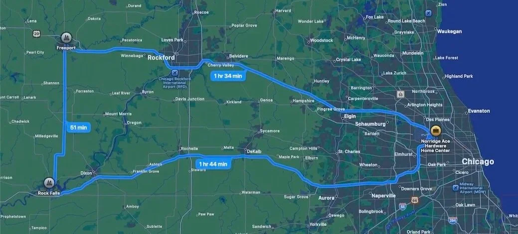 above: my route from Chicago to Rock Falls to Freeport to Chicago
