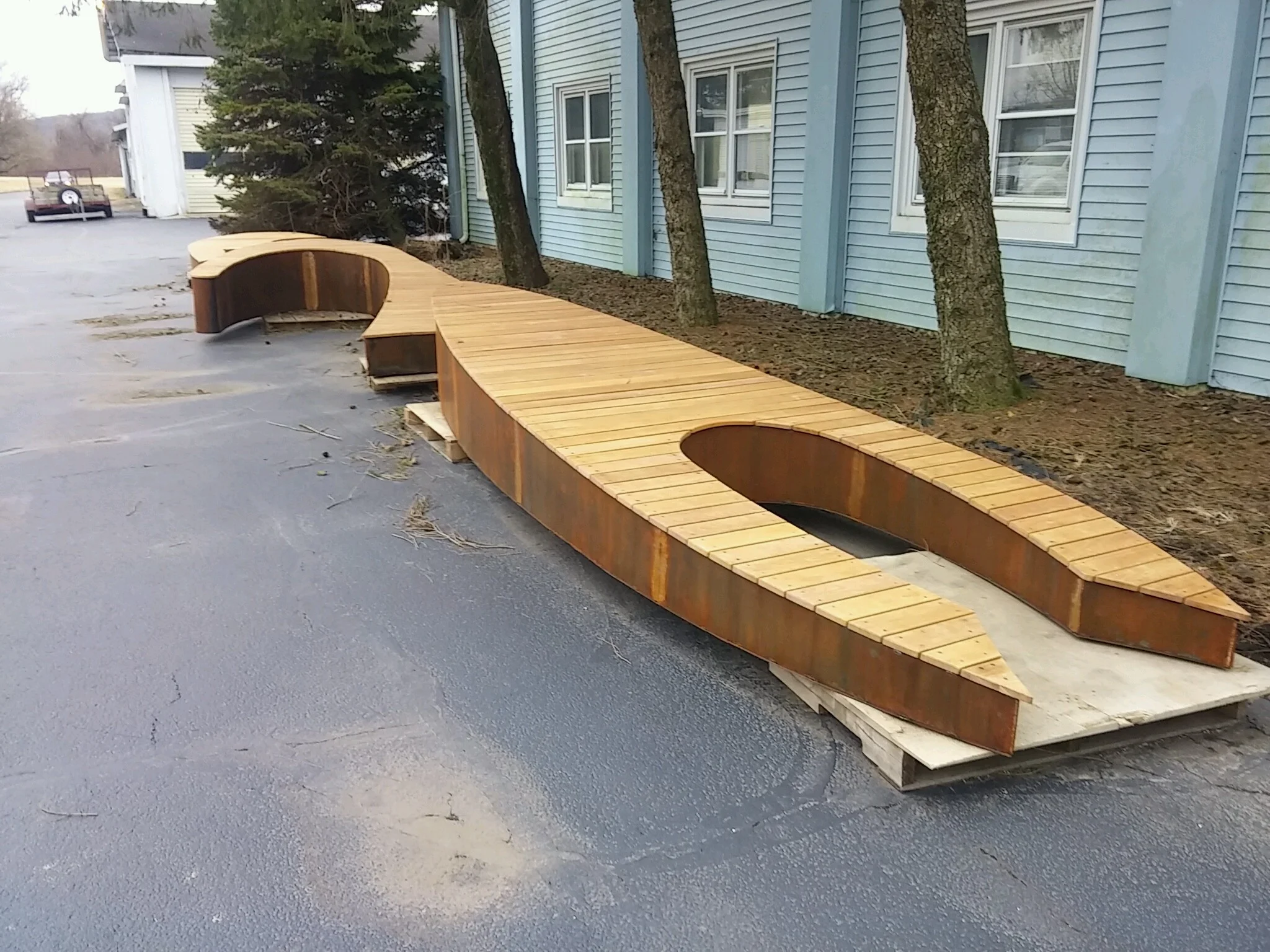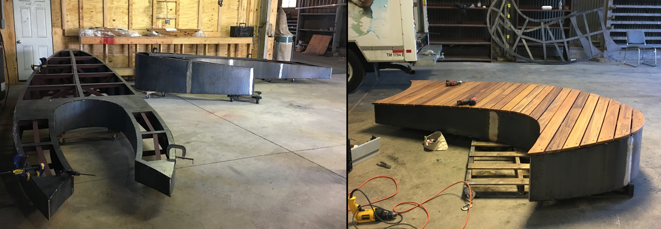 Shadow Benches in progress, from left to right: Winter Solstice, Summer Solstice, and Spring Equinox (completed). The teak looks better than expected and I can't wait to see the wood and Corten steel once weathered in a year or so.